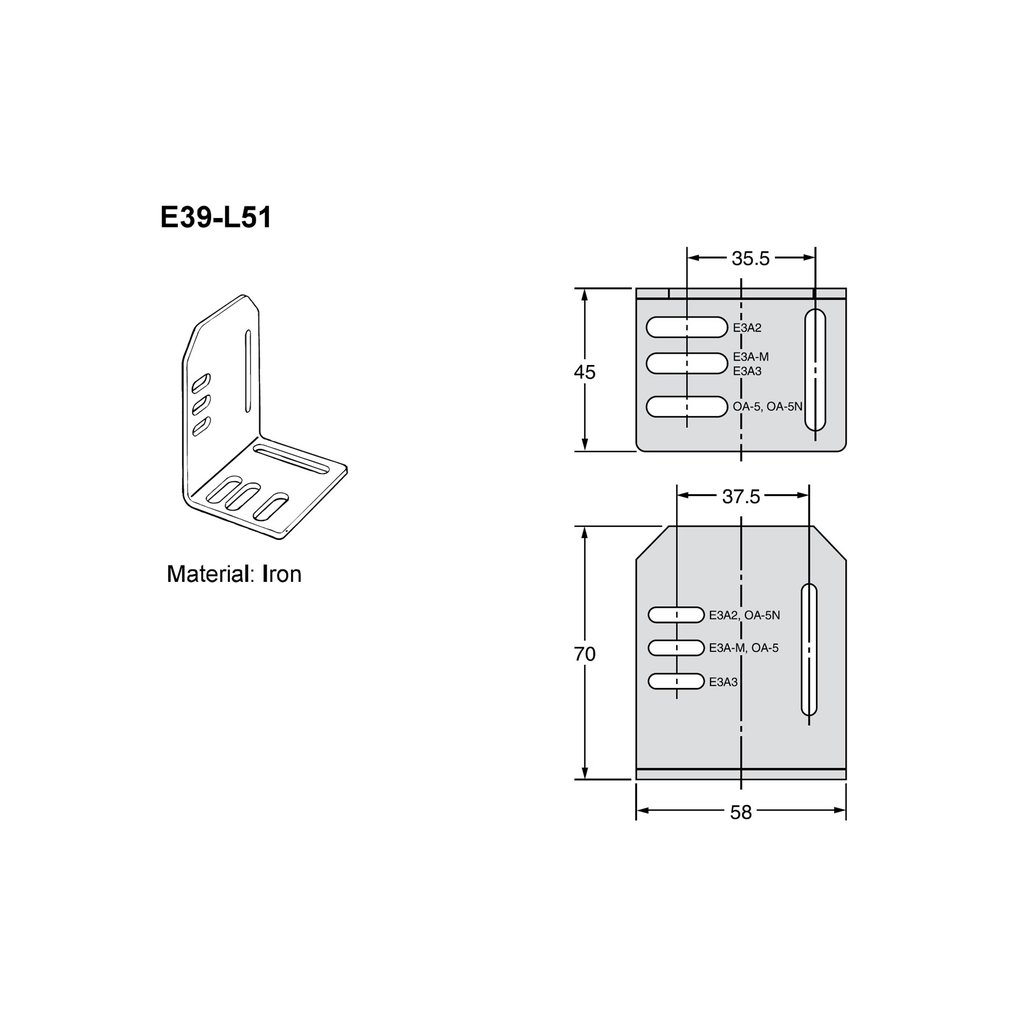 | Đặc điểm kích thước nổi bật | Giá đỡ cho E3JM, bản đứng rộng 58 mm, chiều cao tới khoảng 70 mm; hỗ trợ chỉnh cao trục quang. |