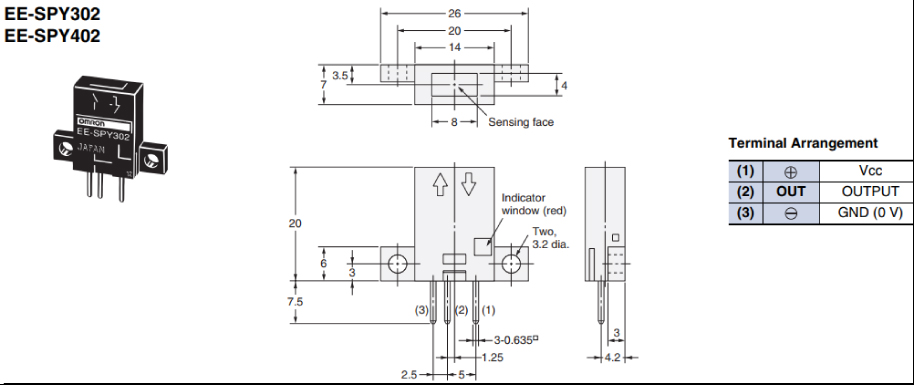 Cảm biến quang EE-SPY302 Loại phản xạ khuếch tán. 5-24VDC, Khoảng cách phát hiện 5mm, Đầu ra NPN Dark-On