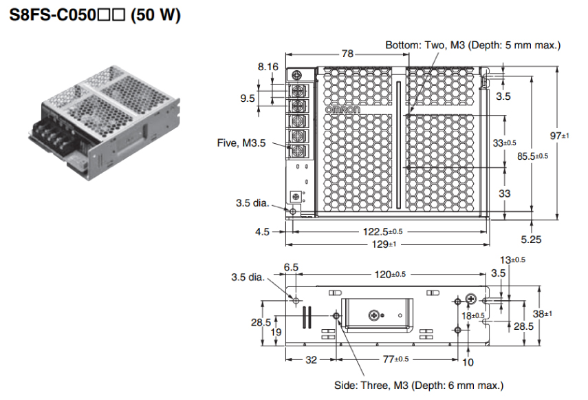 Bộ Nguồn S8FS-C05005 Khối đầu vít hướng lên trên, 50W, điện áp đâu vào 100~240VAC, Điện áp đầu ra 5VDC 10A